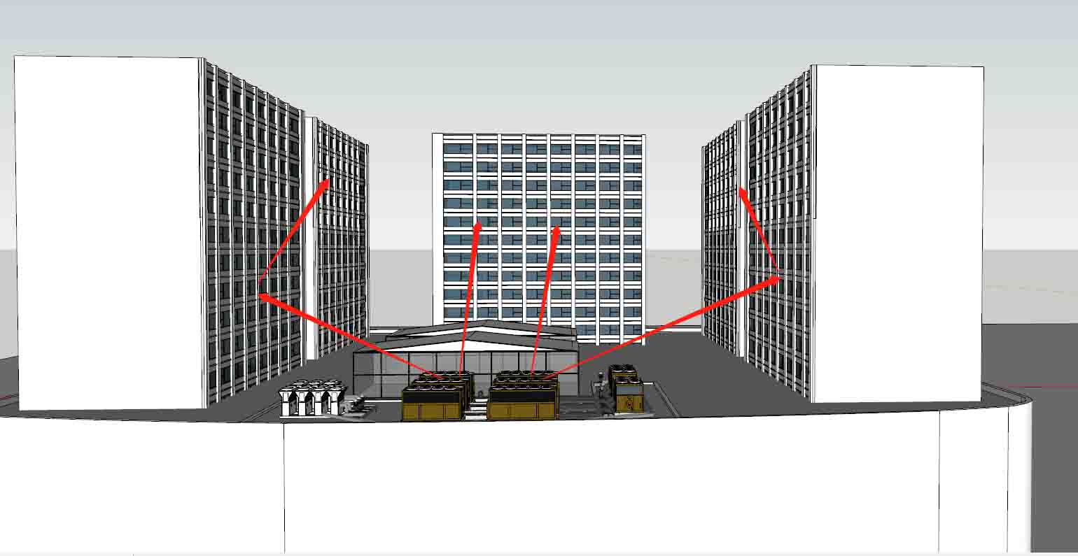 “仁懷國貿購物中心”地處仁懷市,總規模近3萬平方米,是購物、休閑、娛樂、餐飲、文化等為一體的體驗式綜合時尚購物中心。家門口的購物廣場極大方便了人們的購物與生活,但同時也帶來了噪聲擾民的問題。嚴重影響周邊居民的生活。國貿商場共有6層,被住宅包圍在其中,而屋頂安裝有8臺螺桿風機設備、7臺空調設備機組及7臺水泵設備。這些設備長期運行發出大量的噪聲,讓住在附近的居民痛苦不堪,而商家及開發商也因為噪聲投訴而影響商場經營。
